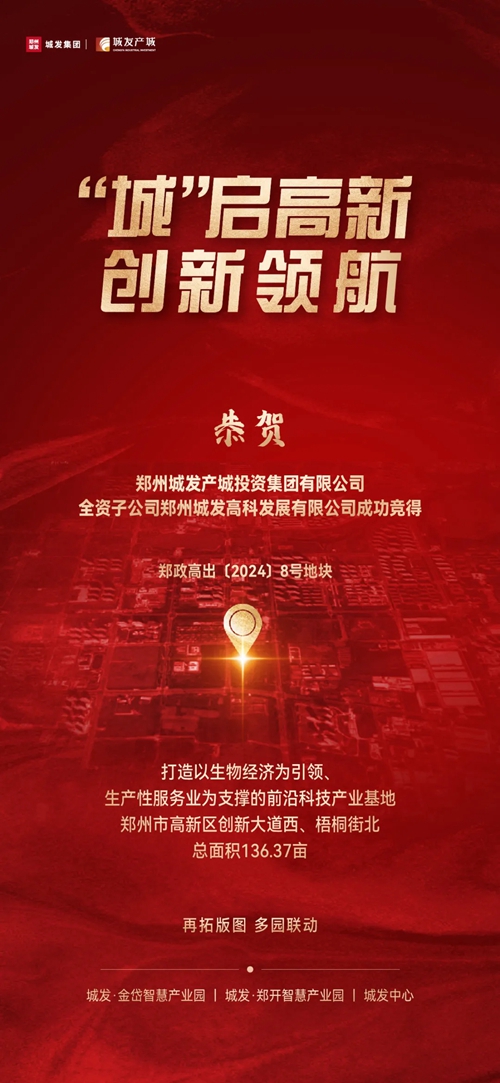 9月29日,鄭州城發產城投資集團有限公司全資子公司鄭州城發高科發展有限公司成功競得鄭政高出〔2024〕8號地塊,該地塊位于鄭州市高新區創新大道西側、梧桐街北側,為一類工業用地(小微企業園用地),總面積136.37畝。