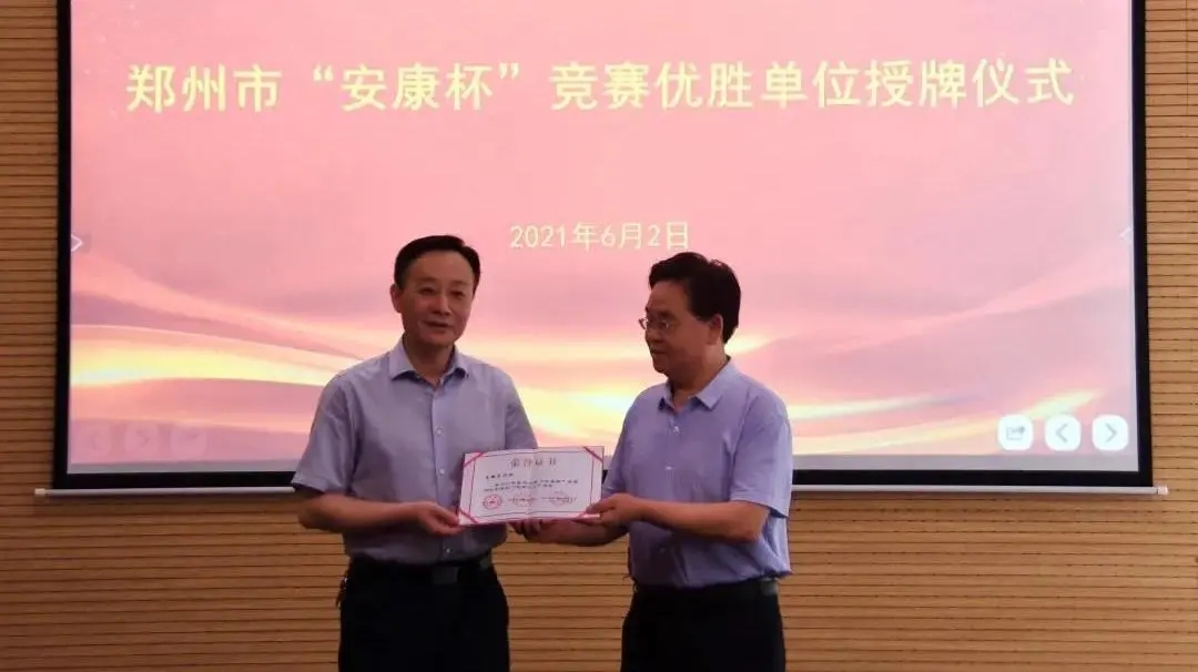 6月2日下午,鄭州市總工會機關工會主任王銀倉、市總工會勞動和經濟部部長宋慧分別向集團兩家獲獎公司頒發鄭州市“安康杯”競賽優勝單位獎牌。